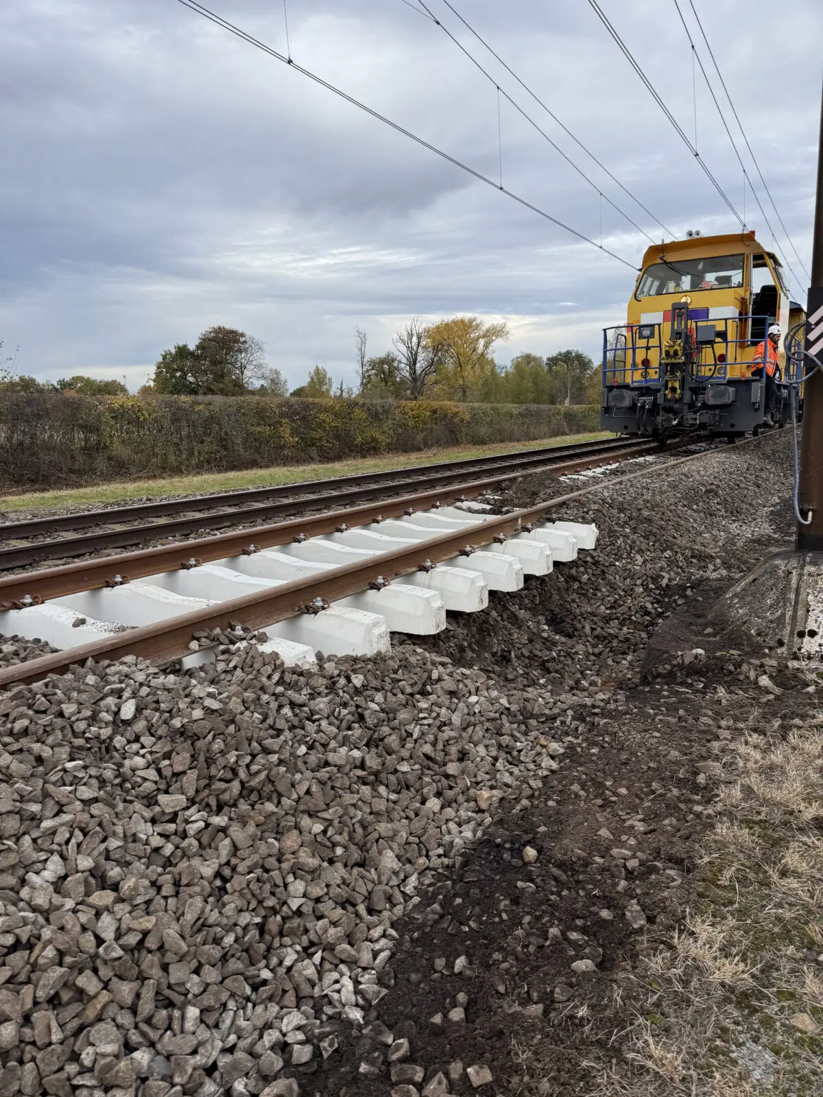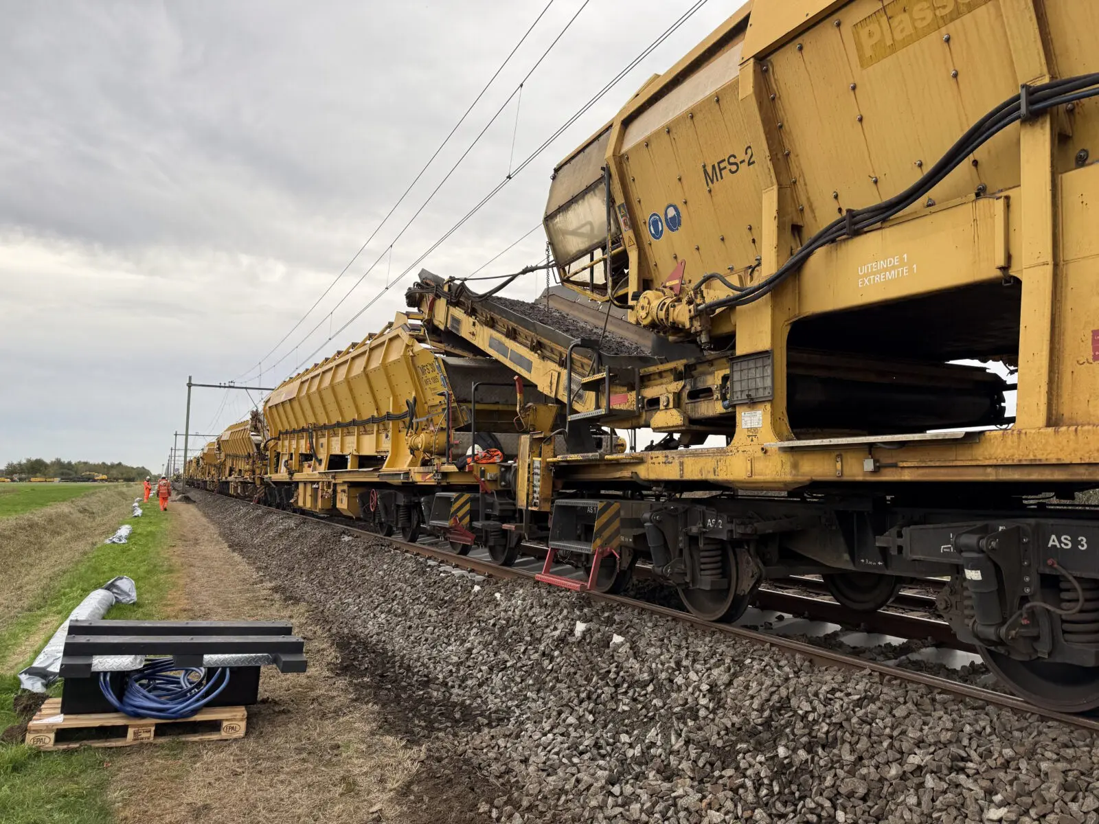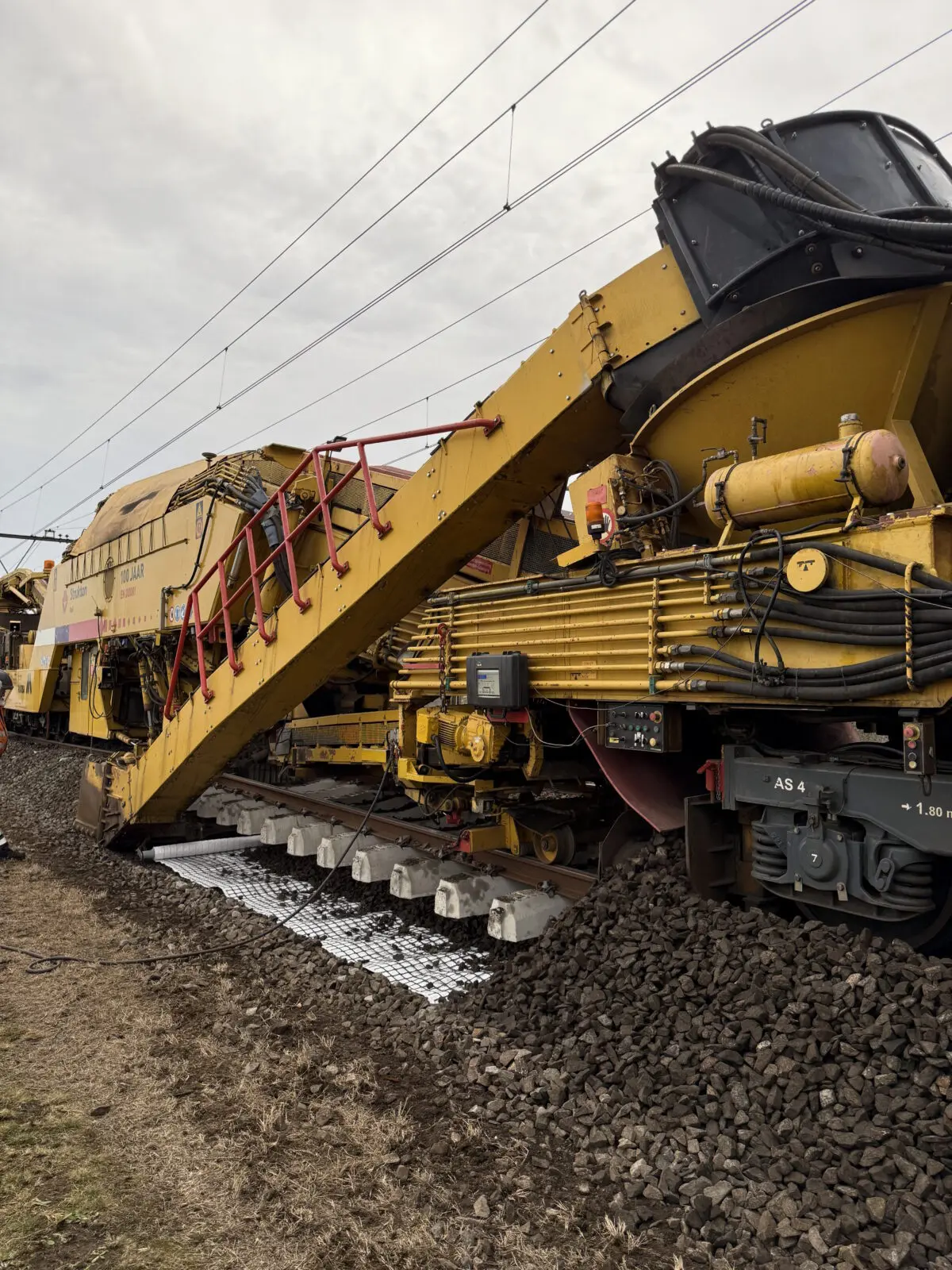 Zoals bij elk groot project kwamen er ook dit weekend uitdagingen op ons pad. Door een grote calamiteit arriveerde de ballastafvoermachine veel later dan gepland, waardoor we acuut een tekort aan kranen hadden om de ballast goed af te werken. Alsof dat nog niet genoeg was, raakte tijdens het transport vanaf het depot de vernieuwingstrein beschadigd door een nog onbekende oorzaak. Het gevolg: vijf uur vertraging en een flinke puzzel om het plan aan te passen en toch productie te draaien.