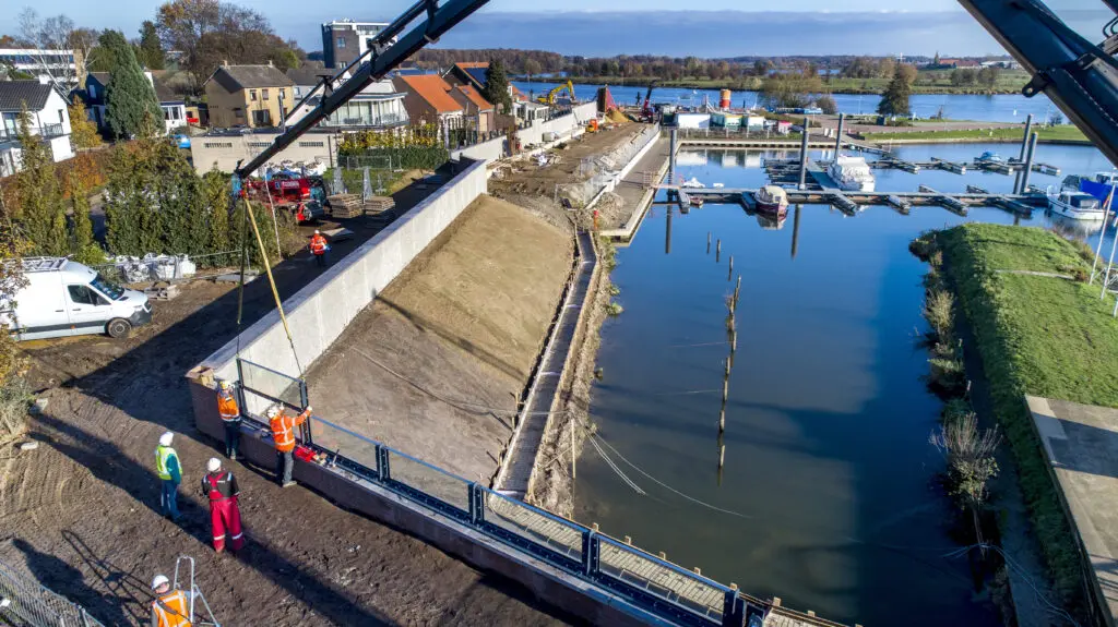 We hebben de kering verhoogd en vervangen, inclusief nieuwe coupures, en infrastructuur aangepast. Om droge voeten te houden hebben we de ruim 1.600 meter lange dijk opgehoogd en deze plaatselijk verlegd. Ook pasten we twee stuwtjes aan. In plaats van de zo’n 500 meter lange keermuur kwam een nieuwe hogere harde kering, die deels uit glazen panelen bestaat. In deze muur bevinden zich ook doorgangen (coupures). Deze hebben we vervangen en voorzien van nieuwe keermiddelen. Bij een nieuwe kering hoort in dit geval ook aangepaste infrastructuur. We zorgden voor het inrichten van percelen van particulieren en hebben het verleggen en aanpassen van kabels en leidingen gecoördineerd.