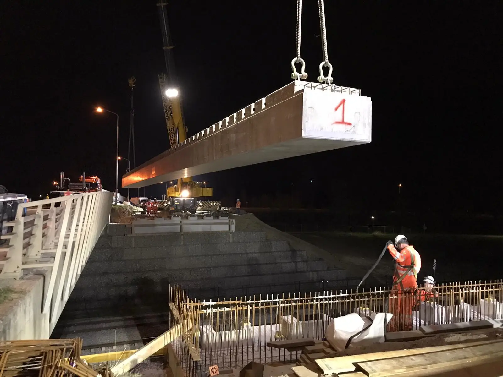 Terwijl er in de nacht vier uur geen treinen reden op het onderliggende spoor, zijn er zes betonnen liggers met een lengte van 33 meter en gewicht van 60 ton per stuk gelegd. Daarna is de brug verder afgebouwd: de schampstroken zijn gestort, het leuningwerk is geplaatst en de voegconstructie en het asfalt zijn op het dek aangebracht. Het project is opgeleverd ruim voor de geplande einddatum, bouwvak van 2022.