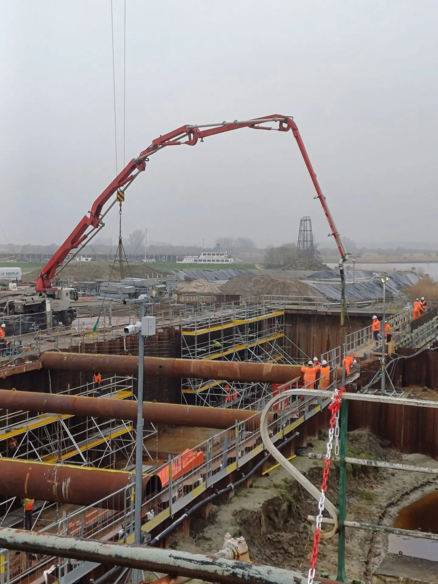 Naast het betonwerk is gestart met het werktuigbouwkundige deel: de droogzetschotten en de krooshekreiniger voor het gemaal. Rond de zomer komt de provinciale weg op z’n oude plek over het nieuwe dek en vervalt de tijdelijke hulpbrug voor het verkeer. “Rond de zomer plaatsen we ook de drie gigantische pompen van 1,85-meter doorsnee”, vertelt Marcel. “Ze zijn zo gemaakt dat vissen er onbeschadigd doorheen gaan. Overgangsstukken tussen de vierkante betonkoker en de ronde pompen zorgen voor een soepele instroom van water zonder wervelingen. Zodra we de overgangsstukken hebben gestort, gaan de pompen naar de fabriek van leverancier Stork in Hengelo voor de inbouw van de elektrotechnische installaties.”